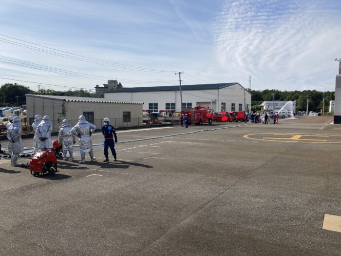 複数の消防ポンプを中継し、ホースを延長して水を送り続ける訓練です。