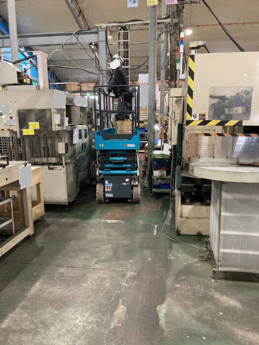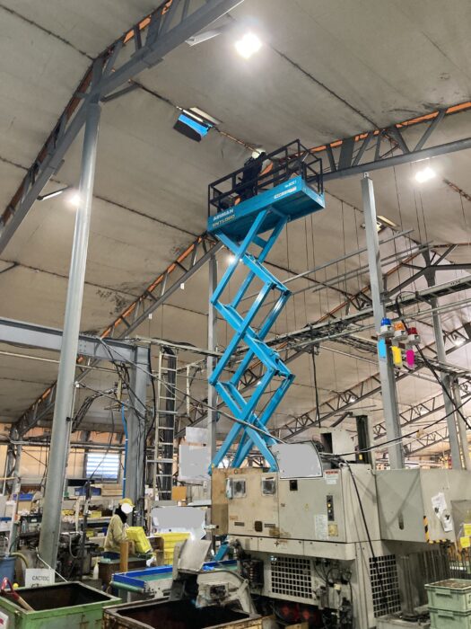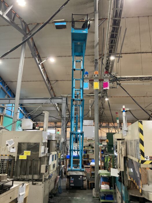 本日の作業は自走式の高所作業車を使用しての、天井の自動火災報知設備の感知器の取り換えです。